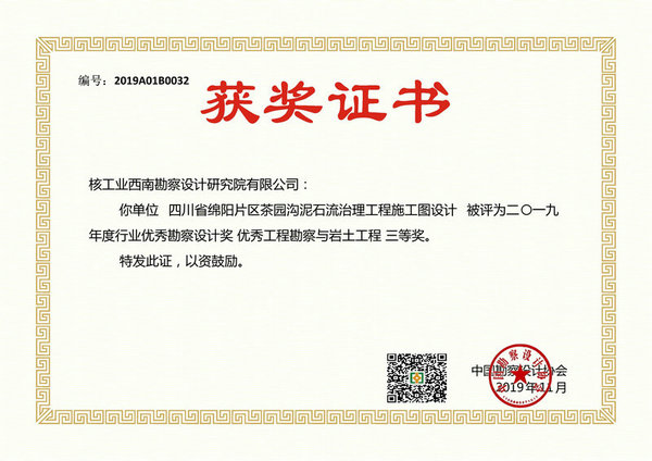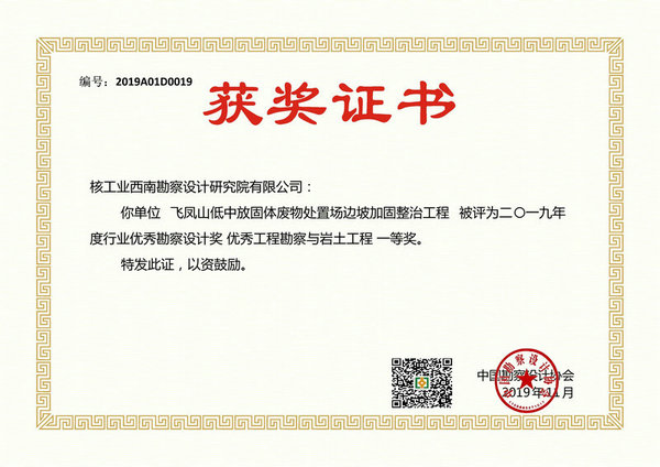 近日,中國勘察設(shè)計(jì)協(xié)會(huì)2019年度工程勘察、建筑設(shè)計(jì)行業(yè)和市政公用工程優(yōu)秀勘察設(shè)計(jì)獎(jiǎng)評(píng)選結(jié)果重磅揭曉!公司報(bào)送的兩項(xiàng)成果榮獲大獎(jiǎng),其中飛鳳山低中放固體廢物處置場邊坡加固整治工程獲得優(yōu)秀工程勘察與巖土工程國家級(jí)一等獎(jiǎng),四川省綿陽片區(qū)茶園溝泥石流治理工程施工圖設(shè)計(jì)獲得優(yōu)秀工程勘察與巖土工程三等獎(jiǎng)!